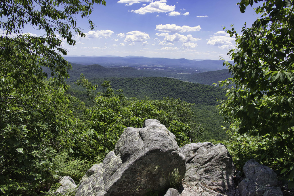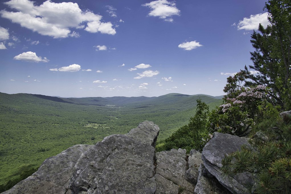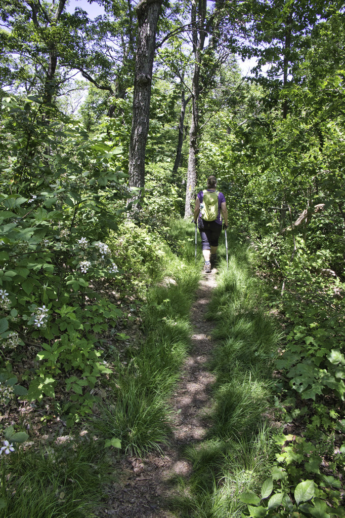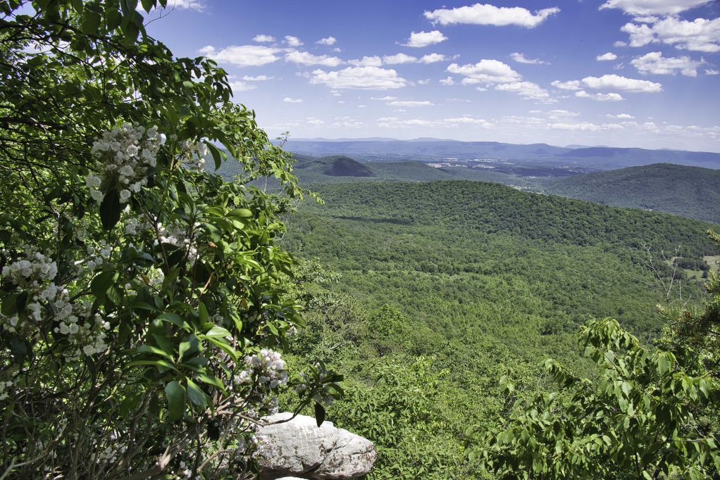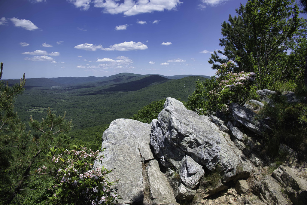 In late May/early June mountain laurel are in bloom along much of the trail. In autumn the colorful fall foliage is spectacular. At .5 miles is the first of several partial views to the east. Massanutten Mountain and Shenandoah National Park loom in the distance. Several spur trails lead to other viewpoints as you continue south on the trail. The climb becomes a little steeper and several switchbacks aid the ascent.