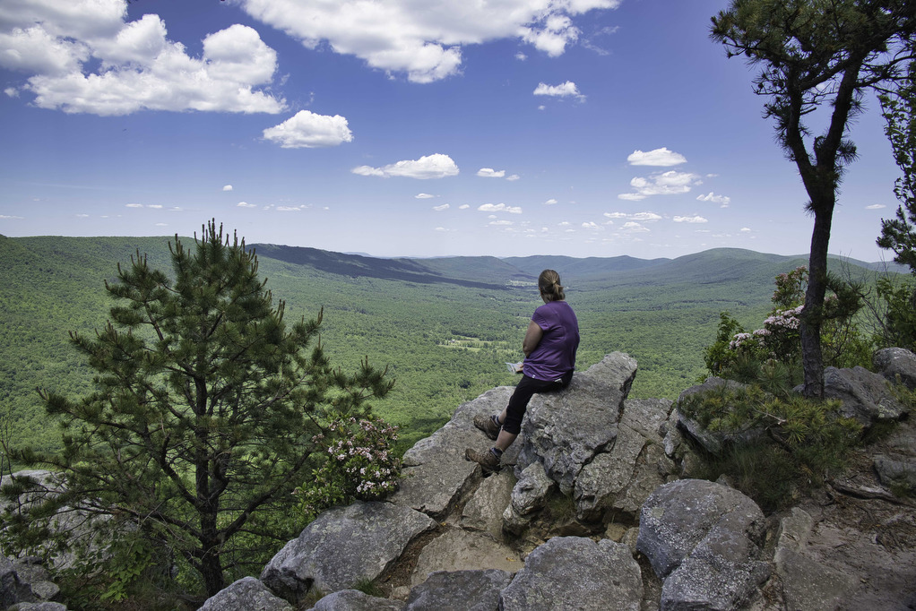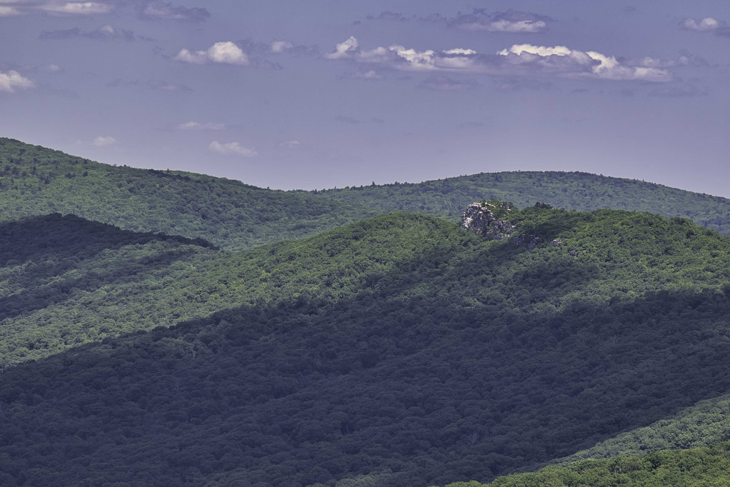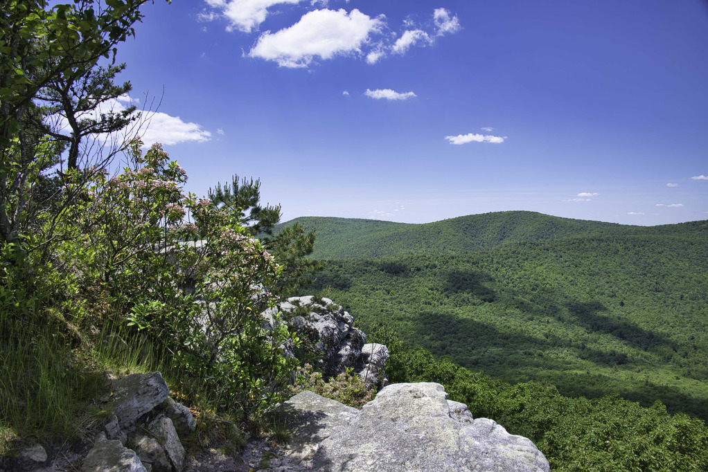 After the 2nd scramble, you will be at the summit of Tibbet Knob at 2,930 feet. 180° vistas open up to the west. Much of what you see before you is West Virginia. To the north is the rocky summit of Big Schloss, which translates to “big castle” in German. From this vantage point, it is easy to see why it resembled a castle to early German settlers. Retrace your steps to descend and return to the parking area.