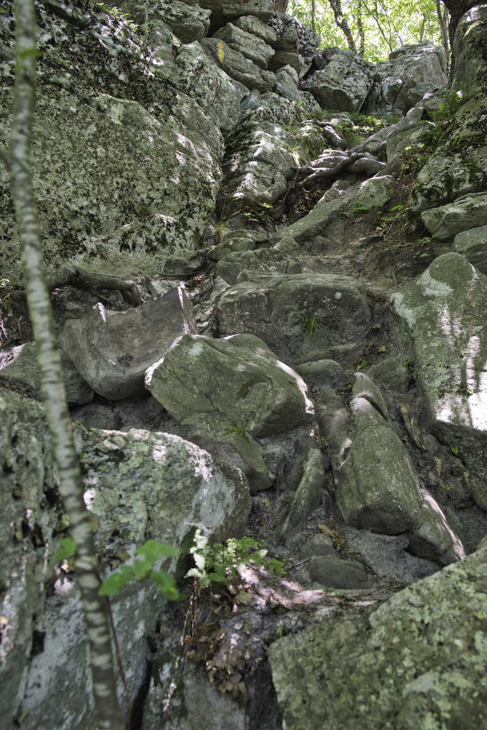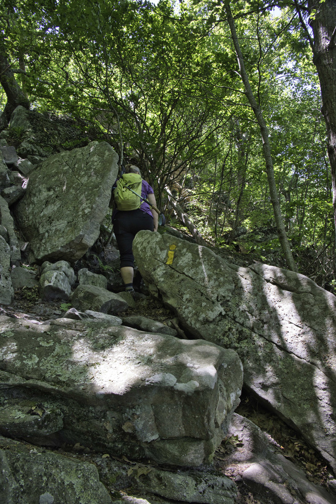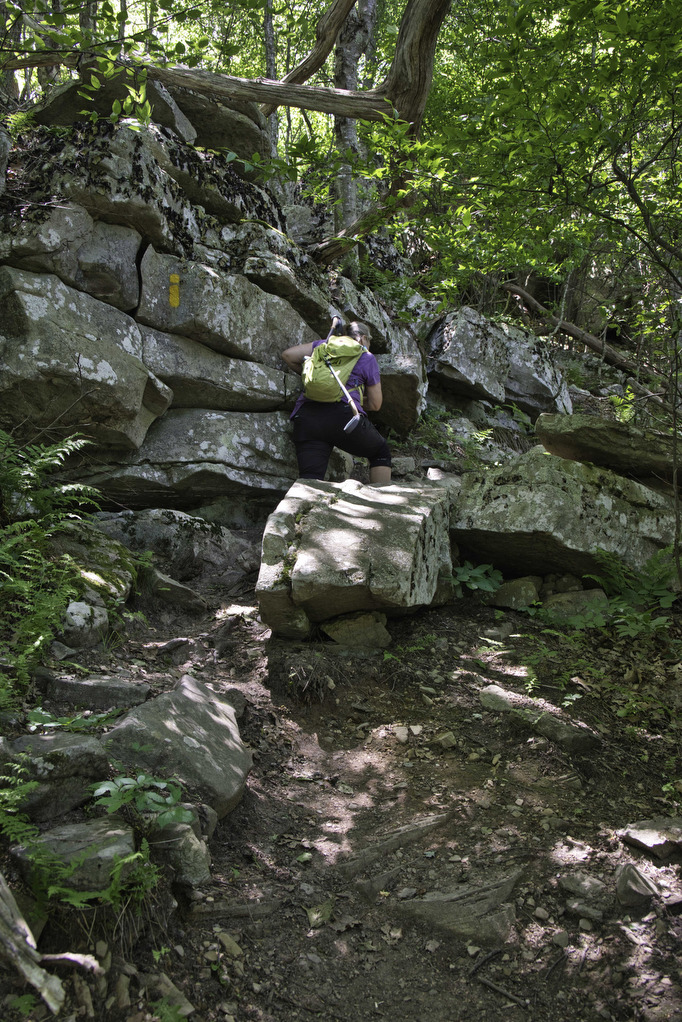 From the Wolf Gap parking area, cross the road and follow signs to the yellow-blazed Tibbet Knob Trail. The trail passes through a picnic area and soon the elevation increases and so do the rocks. There may be a few trails in the Gorge Washington National Forest which are not rocky, but we have yet to find them.